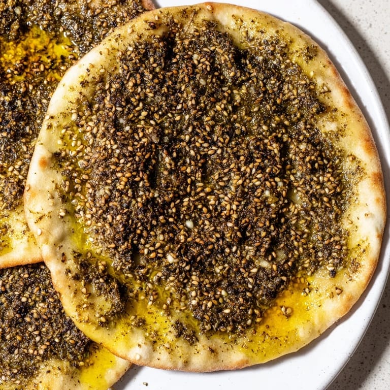 Zaatar is a blend that combines dried thyme, sumac, and sesame seeds—each ingredient plays a role. The thyme gives you herbs, the sumac brings a subtle tartness that wakes up your palate, and the sesame adds nuttiness and texture. When you mix it with olive oil, you're creating a paste that clings to the warm dough and infuses every bite. I learned this the hard way after trying to sprinkle dry zaatar on top of baked bread and watching most of it slide off; the oil is what makes it stick and sing.