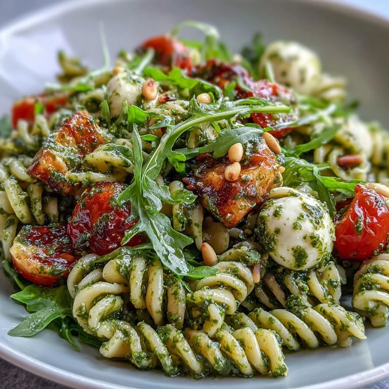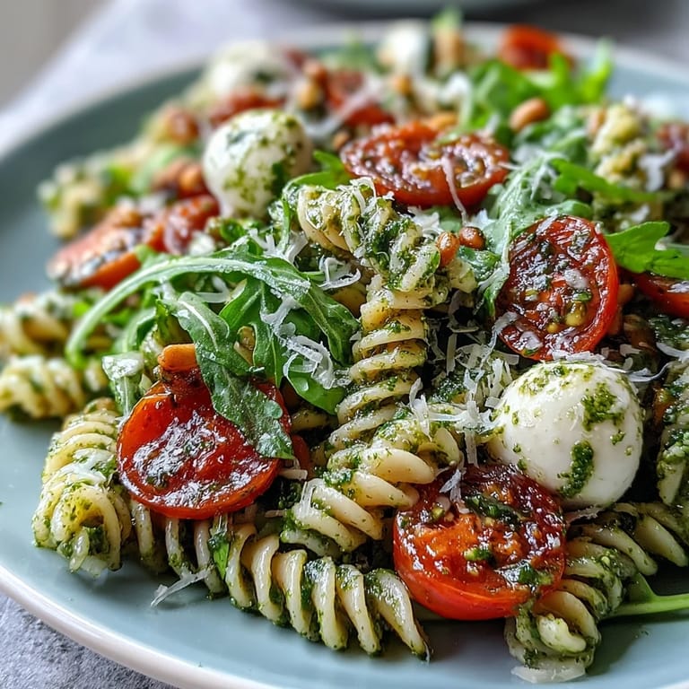 Save This pasta salad showcases the harmony of simple ingredients: tender pasta, sweet cherry tomatoes, and creamy mozzarella, all enhanced by the herbal brightness of fresh pesto. Adding baby arugula or basil leaves gives a peppery or fragrant touch, balancing the textures and flavors beautifully.